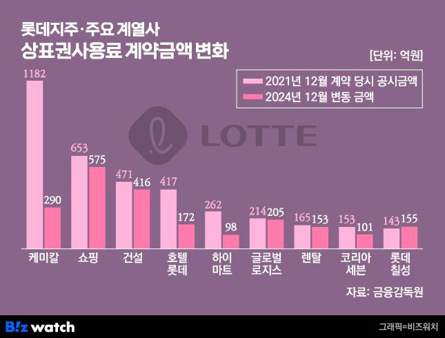 롯데하이마트 역시 2022~2024년 262억원의 상표권 수수료를 내기로 했다가 98억원밖에 지불하지 못했습니다. 이외에도 △롯데쇼핑(653억원→575억원) △롯데건설(471억원→416억원) △코리아세븐(153억원→101억원) 등 대부분의 계열사가 당초 계약보다 적은 수수료를 냈습니다.