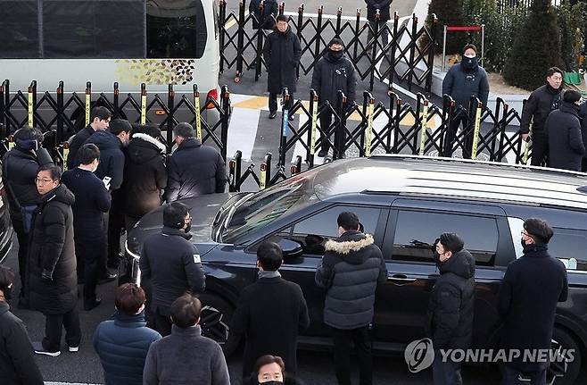 [윤석열 대통령의 체포영장을 집행하기 위해 나선 고위공직자범죄수사처 수사관들을 태운 차량이 3일 서울 한남동 대통령 관저 입구에 도착해 대기하고 있다 (사진=연합뉴스)]