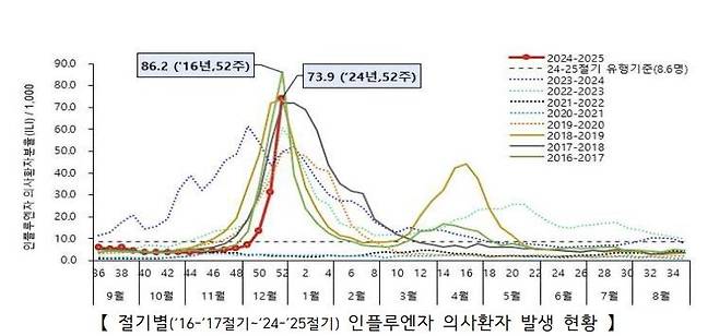 1천 명당 151.3명으로, 이번 2024∼2025 절기 독감 유행 기준(1천 명당 8.6명)의 17.6배에 해당한다.