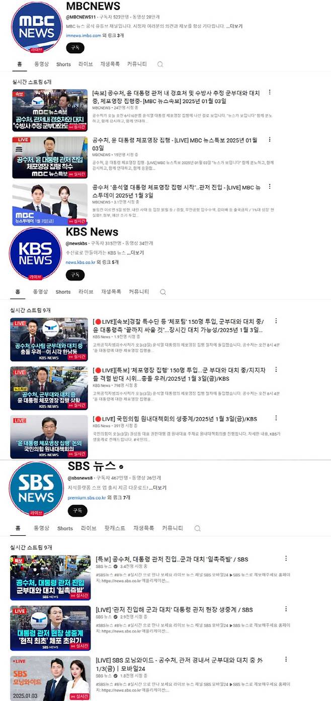 고위공직자범죄수사처(공수처)가 헌정사상 초유로 현직 대통령에 대한 체포 영장을 집행하고 있는 가운데 방송 3사 유튜브 라이브 방송에 윤석열 대통령의 체포 과정을 지켜 보기 위한 시청자 수십만명이 몰렸다.