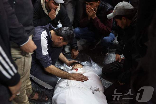 (가자 AFP=뉴스1) 우동명 기자 = 2일(현지시간) 팔레스타인 가자 지구 병원에서 주민들이 하마스와 전쟁 중인 이스라엘 군의 포격을 받아 숨진 희생자를 안고 오열하고 있다. 2025.01.03