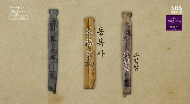 종이가 없던 시절, 나무에 글씨를 쓴 건데, 이걸 '목간'이라고 해. 첫 번째 목간을 보면, 한자로 '지치 3년'이라고 쓰여있어. 이건 중국 원나라 연호로, 서기 1323년이라는 뜻이야. 그리고 다른 목간을 보면, 한자로 '동복사', 그리고 '조적암'이라고 적혀있어. 바로 일본에 있는 절 이름이야. 이 배가, 일본을 오가던 무역선이라고 추측할 수 있겠지. 바다에서 나온 도자기와 그릇들, 모두 일본으로 보낼 무역품이었던 거야. 당시 일본에서 중국 도자기가 인기가 많았대.