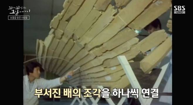 발굴단은 유물을 찾으면서, 배를 인양할 계획을 세웠어. 먼저 유물이 나오는 포인트에 철제로 만든 그리드라는 걸 설치해. 그리드에 번호를 매겨서 유물들의 위치를 기록한 뒤, 부서진 배의 조각을 하나씩 연결하는 거야. 그렇게 발굴단의 발굴작업은 1984년까지, 9년에 걸쳐 이뤄졌어.