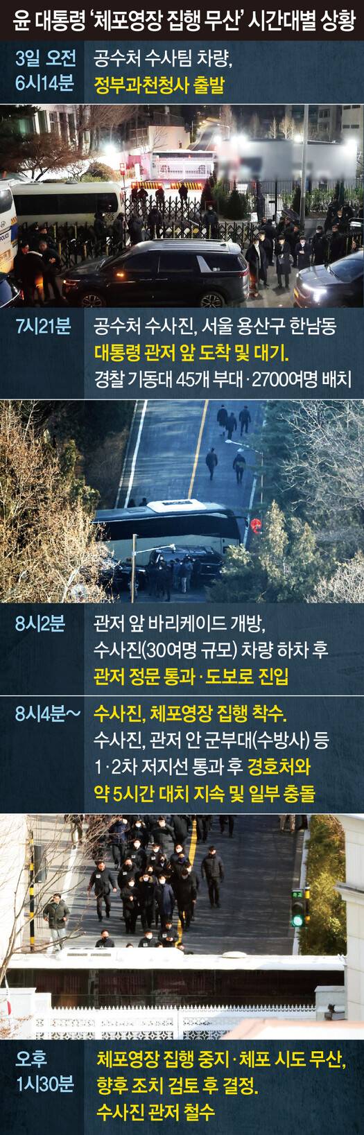 고위공직자범죄수사처(공수처)는 3일 아침 8시2분께 윤 대통령에 대한 체포영장 집행에 나섰지만, 경호처의 방해로 5시간30분 가량 대치 끝에 낮 1시30분께 철수했다. 공수처는 “체포영장 집행과 관련해 계속된 대치상황으로 사실상 체포영장 집행이 불가능하다고 판단”했다고 밝혔다.