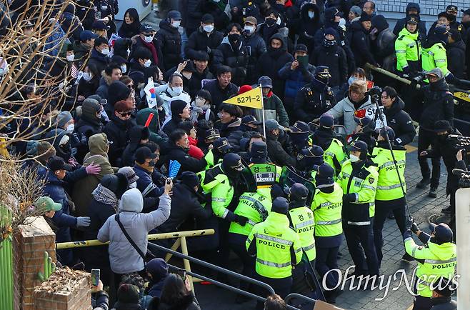 | ▲ 3일 오전 서울 용산구 한남동 대통령 관저에서 공수처가 '내란 우두머리'(내란수괴) 혐의를 받는 윤석열 대통령에 대해 체포영장 집행을 시도하는 가운데, 관저 입구인 한남초등학교 앞에서 윤석열 지지자와 경찰 사이에 몸싸움이 벌어지고 있다. |