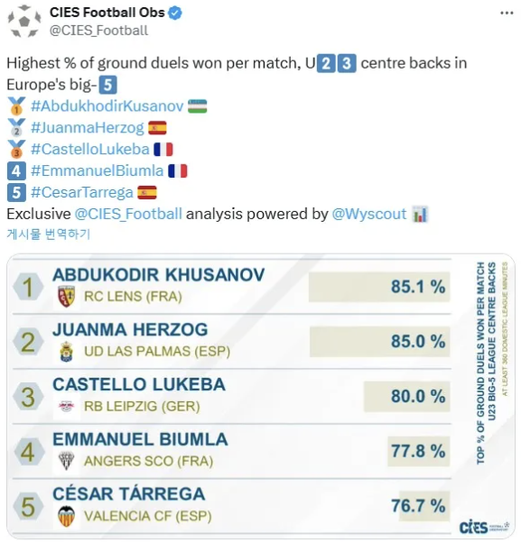 이젠 가능성이 아니라 성적으로 증명됐다. 리그 8라운 기준 유럽 매체 '레퀴프'에 따르면 후사노프는 '유럽 5대 리그 23세 이하 센터백 중 경기당 지상볼 경합 성공률 1위'라는 놀라운 활약을 보였다고 한다.