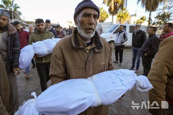 [데이르 알-발라(가자지구)=AP/뉴시스]이스라엘군의 공습으로 2일 밤 생후 6개월 된 조카를 잃은 팔레스타인의 한 남성이 3일 가자지구 데이르 알-발라의 알 아크사 순교자병원에서 조카의 시신을 안고 장례 기도를 준비하고 있다. 가자지구에서 2일 밤부터 3일 새벽 사이 어린이를 포함해 최소 30명이 이스라엘군의 공습으로 추가로 사망, 24시간 동안 사망자 수가 56명으로 늘어났다고 병원 직원들이 3일 밝혔다. 2025.01.03.