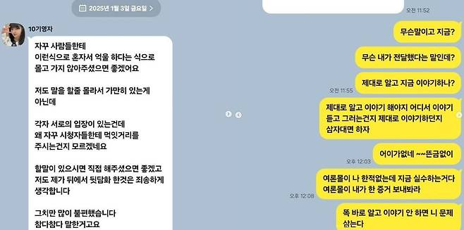 공개된 카톡 대화에서 영자는 정숙에게 "자꾸 사람들한테 이런식으로 혼자서 억울하다는 식으로 몰고 가지 않아주셨으면 좋겠다. 저도 말을 할 줄 몰라서 가만히 있는게 아닌데 각자 서로의 입장이 있는건데 왜 자꾸 시청자들한테 먹잇거리를 주시는 건지 모르겠다"고 불만을 토로했다.