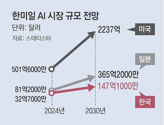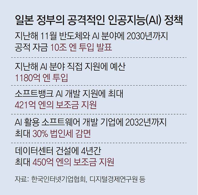 이시바 시게루(石破茂) 일본 총리는 지난해 11월 반도체와 AI 분야에 2030년까지 10조 엔(당시 약 91조 원)의 공적 자금을 투입하겠다고 발표했다. 외국인 창업 규제를 완화해 해외 인재를 적극적으로 유치하고 AI 개발에 필수 인프라인 그래픽처리장치(GPU)를 정부 차원에서 구입하기도 했다.