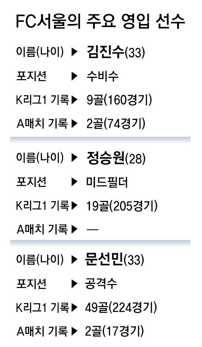 서울이 영입한 세 선수는 모두 주전급이다. 하지만 김 감독은 ‘신입생’들이 기존 서울 선수들과 경쟁해야 한다고 강조했다. 그는 “좋은 선수들을 영입한 덕에 우리 팀의 축구가 발전하기 위한 퍼즐이 하나씩 맞춰지고 있는 느낌이다. 하지만 우리 팀에 붙박이 주전이라는 건 없다. 모든 선수가 (주전) 경쟁을 해야 한다”고 말했다.