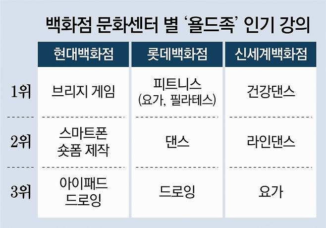 4일 현대백화점에 따르면 지난해 압구정본점, 무역센터점 등 주요 점포 11곳에서 평균 20명 내외로 하는 브리지 게임 강좌 수강생은 95% 이상이 50, 60대였다. 수요가 폭발적으로 증가하면서 지난해 8개에서 올해 52개로 강좌 수가 늘어났다. 브리지 게임 강좌는 신청 접수가 조기 마감된다.