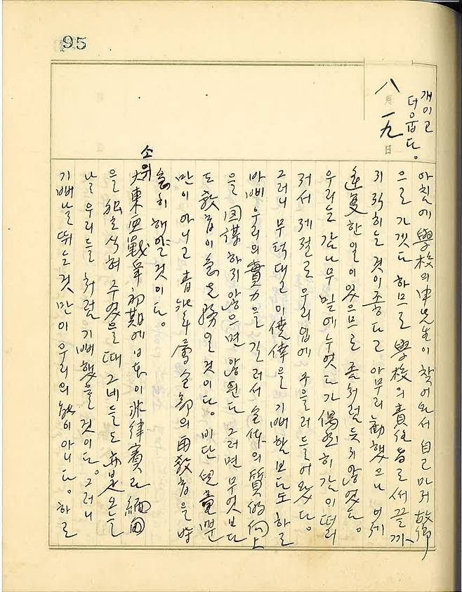직원들에게 평소보다 더 자중해 달라는 말을 하고 한 시간쯤 일 보다 곧 문 닫고 학교로 가니 벌써 많은 군중이 모여서 환호를 부르고 면장 한필수(韓弼洙) 씨가 단상에 올라서 그 특이한 제스추어로 일장연설을 하는 중이었다. 앞으로 불살라 버릴 일본기를 밟으면서.