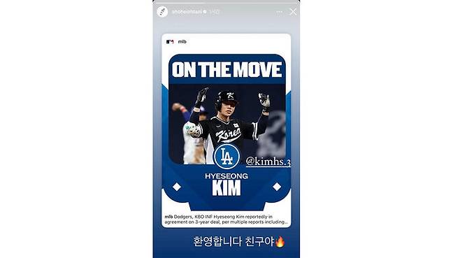 오타니는 김혜성의 계약 소식이 전해지자 자신의 소셜네트워크서비스(SNS) 인스타그램 피드를 통해 김혜성의 사진과 함께 한글로 '환영합니다 친구야'라고 적었습니다.