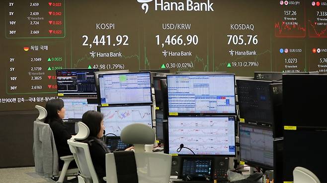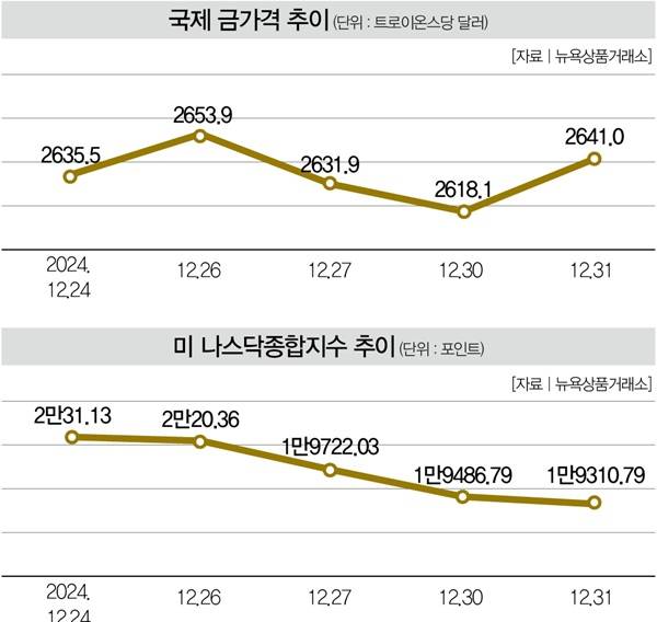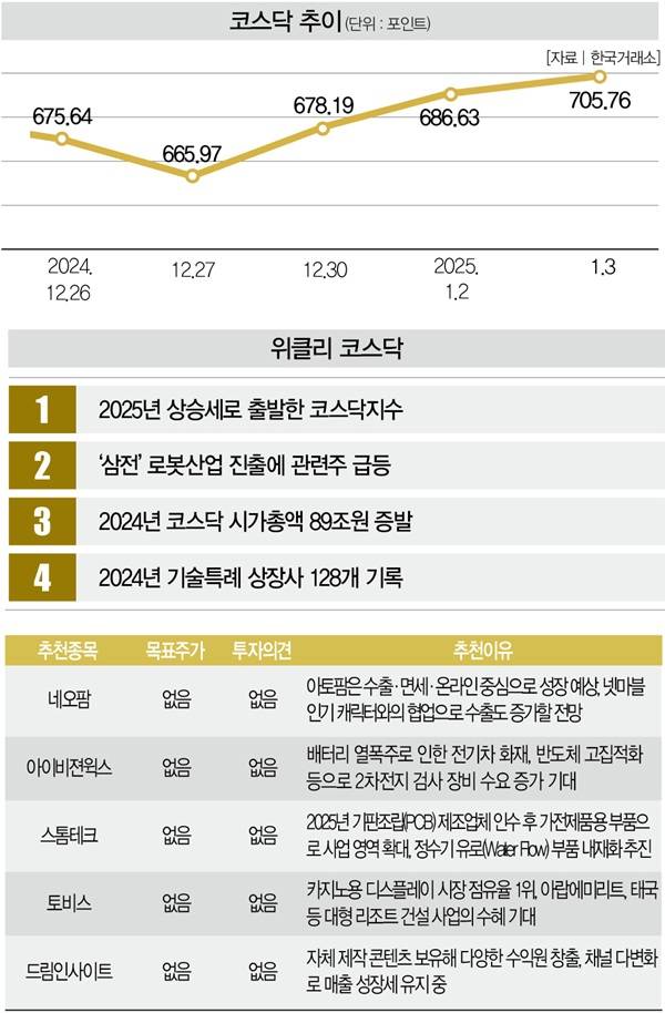 # 1월 3일엔 깜짝 상승세를 기록했다. 코스피지수는 전 거래일 대비 1.79% 상승한 2441.92포인트로 거래를 마치며 6거래일 만에 상승세로 돌아섰다. 코스닥지수는 2.79% 오르며 705.76포인트를 기록했다. 코스닥지수가 700포인트대를 웃돈 건 2024년 11월 12일(710.52포인트) 이후 52일 만이다.