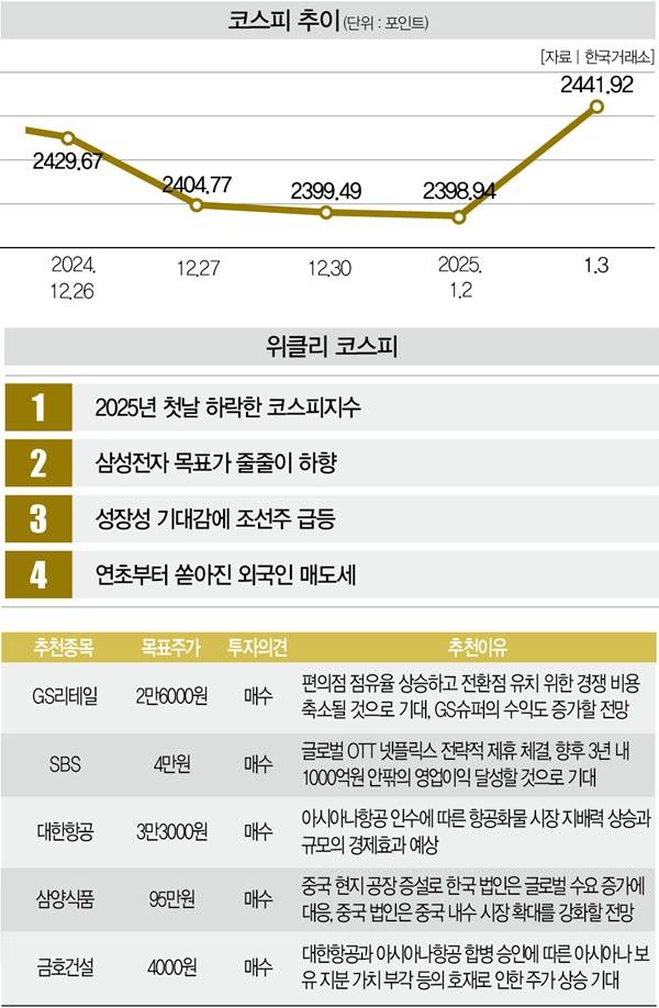 # 2025년 국내 증시가 가다 서다를 반복했다. 시작은 부진했다. 2025년 첫 거래일인 지난 2일 코스피지수는 전 거래일 대비 0.02% 떨어진 2398.94포인트를 기록하며 5거래일 연속 하락세를 이어갔다. 코스닥지수는 686.63포인트로 전 거래일 대비 1.24% 오르며 2거래일 연속 상승했지만 투자자의 심리는 새해 첫날에도 싸늘했다.