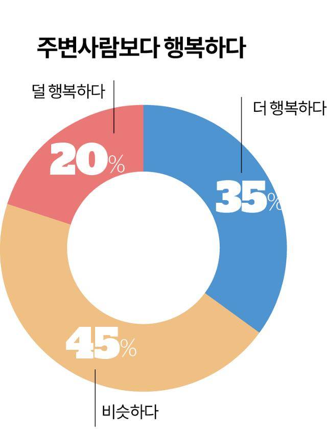 주변과 비교할 때는 어떨까? 주변 사람들과 비슷하게 행복하다는 사람이 45%로 가장 많은 가운데, 주변 사람들보다 더 행복하다는 사람(35%)이 덜 행복하다는 사람(20%)보다 많다.