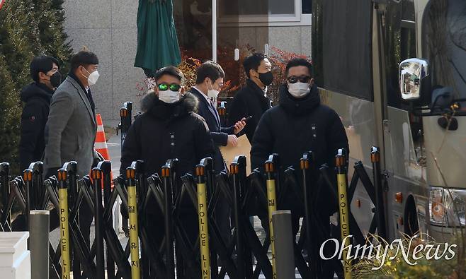| ▲ 윤석열 체포영장 집행 무산, 관저 나오는 공수처 수사관들 12.3 윤석열 내란사태를 수사 중인 고위공직자범죄수사처 수사관과 경찰이 3일 오후 용산구 한남동 대통령 관저에서 윤석열 대통령의 체포영장 집행이 무산되자 철수하고 있다. |
