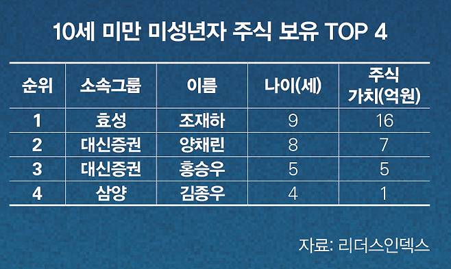 35명의 미성년자 주식 부호 중 10세 미만인 초등학생·유아가 9명 포함됐다는 점도 주목할 만하다. 10세 미만 중 가장 많은 주식을 보유한 사람은 조현상 효성 부회장의 장남 조재하군(9)이다. 주식 평가액은 16억원으로 나타났다.