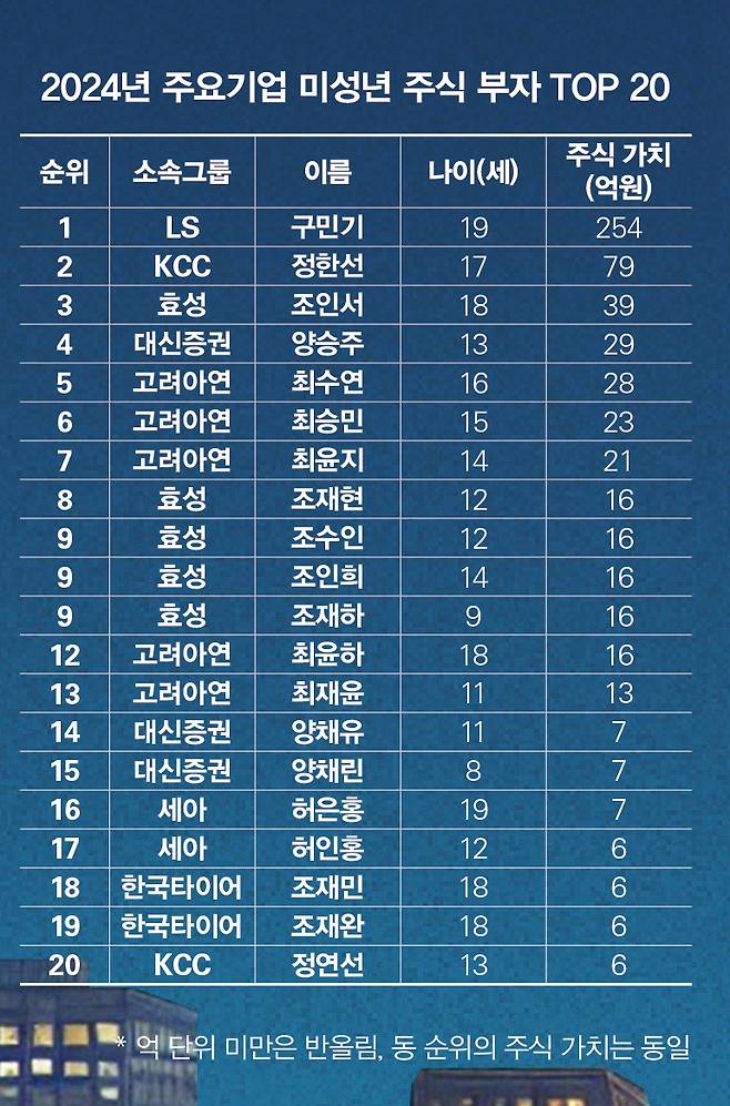 시사저널과 리더스인덱스의 조사 결과, 88개 대기업집단 오너가의 미성년자 주식 부자는 35명으로 조사됐다. 상위 20위 미성년자 주식 부호들이 보유한 주식의 2024년 말 평가액(12월27일 종가 기준)은 613억원으로, 연초(1월31일 종가 기준) 주식 평가액인 560억원 대비 10% 이상 올랐다. 특히 LS, KCC, 효성, 대신증권 등 오너가의 미성년 주식 부호가 1~4위를 차지했는데, 이들이 보유한 주식 평가액만 400억원 이상인 것으로 나타났다.