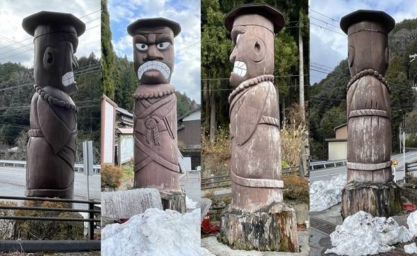 | ▲ 일본 시가현 다가초 가야하라 마을 입구에 세워진 니조보 장승입니다. 해발 고도가 높아서 녹지 않은 눈이 쌓여 있습니다. |