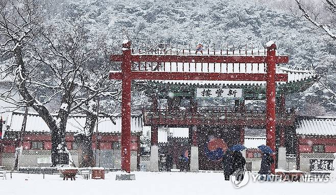 (수원=연합뉴스) 홍기원 기자 = 수도권 곳곳에 대설주의보가 발효 중인 5일 오전 경기도 수원시 팔달구 화성행궁에 눈이 내리고 있다. 2025.1.5