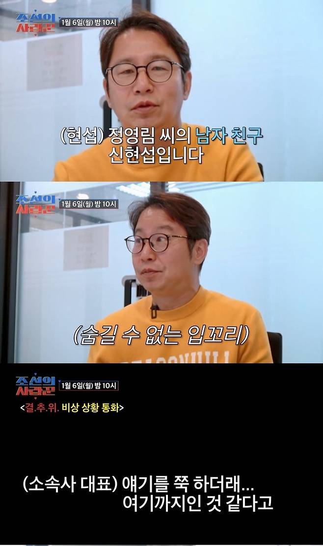 그러나 얼마 뒤 심현섭의 소속사 대표는 제작진에게 전화해 "(영림이) 여기까지인 것 같다고 얘기하더라..."며 애정전선에 문제가 생겼음을 알렸다.