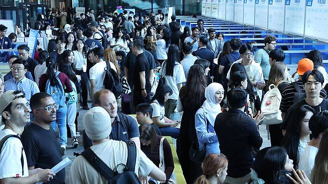 ▲ '2024 부산 외국인 유학생 취업박람회'가 열린 27일 오후 부산 남구 경성대 건학기념관을 찾은 외국인 유학생들로 붐비고 있다.