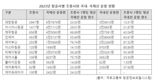 문제는 다른 LCC들도 상황이 크게 다르지 않다는 점이다. 2023년 기준 조종사 1명당 평균 국제선 여객 운항 편수가 가장 많은 곳은 에어부산(76.75편), 그 뒤를 에어서울(75.75편)이 차지했다. 제주항공(68.69편)보다 많았다. LCC 중 대한항공(23.03편)보다 조종사 1명당 평균 국제선 여객 운항 편수가 적은 곳은 이스타항공(14.15편), 플라이강원(14.08편) 단 2곳뿐이다.