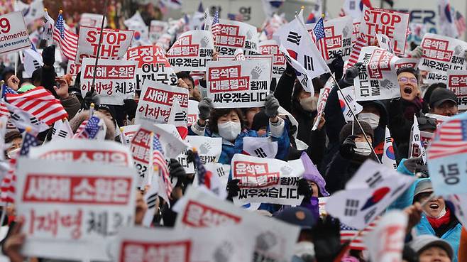 미국 뉴욕타임스(NYT)는 4일(현지시간) '공포와 음모론이 한국의 정치적 위기를 부추긴 방식'이라는 제목의 해설기사에서 "트럼프 미국 대통령 당선인의 배후에 '마가'(MAGA·Make America Great Again·미국을 다시 위대하게)가 있다면 윤 대통령에겐 '태극기 부대'가 있다"고 썼습니다.