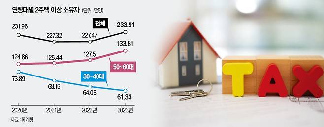 국내 2주택 이상 소유자는 2020년 231만9648명, 2021년 227만3255명, 2022년 227만4713명, 2023년 233만9163명 등으로 연도별로 큰 변동이 없다. 하지만 연령대별로는 다른 흐름이 나타난다. 30~40대는 2주택 이상 보유자가 2020년 73만8985명에서 2023년 61만3365명으로 3년간 17%(12만5620명) 줄었다. 같은 기간 50~60대는 124만8666명에서 133만8124명으로 7.2%(8만9458명) 증가했다. 부모로부터 상속받은 주택이 영향을 준 것으로 분석됐다.