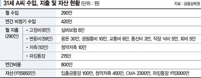 A. 31세 A씨 월 수입은 290만원이다. 연간 비정기 수입은 420만원이다. 월 지출도 290만원이다. 고정비는 실비 6만원이다. 변동비는 용돈(30만원), 생필품비(10만원), 교통비(6만원), 통신비(3만원), 직장 식비(5만원), 회비(5만원) 등 59만원이다. 저축은 청약에 10만원씩 하고 있다. 남는 돈은 파킹통장에 보관하고 있다. 연간비용은 800만원이다. 자산은 입출금통장(100만원), 청약(450만원), CMA(2300만원), 파킹통장(1억3000만원) 등 1억5850만원이다. 부채는 따로 없다.