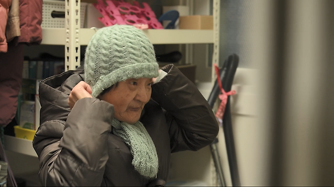 이른 아침, 발달장애인 75살 이희경 할머니가 외출 준비를 합니다. 목도리와 모자를 단단히 챙겨 입습니다.