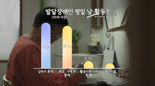 보건복지부 실태조사 결과, 50세 이상 발달장애인의 42%가 대부분의 시간을 집에서 혼자 보낸다고 답했습니다.