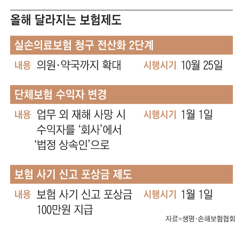 올해부터 실손보험 청구 절차가 더 간단해진다. 가스 사고와 어린이 시설 사고 보상 한도가 상향되고, 보험 사기 외에 보험 사기 알선, 유인, 광고 등의 행위도 신고 포상금이 지급된다.
