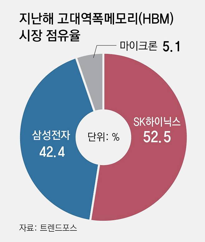 5일 반도체 업계에 따르면 엔비디아는 지난해 말 메모리 협력사들에 블랙웰에 탑재되는 5세대 고대역폭메모리(HBM)인 ‘HBM3E’ 반도체의 전력 효율을 지금보다 더 개선할 것을 요청한 것으로 전해졌다. 한 반도체 기업 임원은 “엔비디아가 HBM의 전력 효율을 개선하라고 요구한 것이 최근 받은 가장 큰 미션 중 하나”라고 말했다.