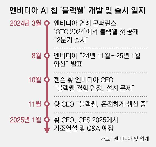 한편 반도체 업계는 7일(현지 시간) 미국 라스베이거스에서 열리는 정보기술(IT) 가전 전시회 ‘CES 2025’를 주목하고 있다. 황 CEO는 올해 CES에서 기조연설과 함께 질의응답을 진행할 예정이다. 이 자리에서 블랙웰 양산 진행 상황과 함께 발열 등 결함 개선 여부에 대해 구체적인 답을 내놓을 것이란 전망이 나온다.