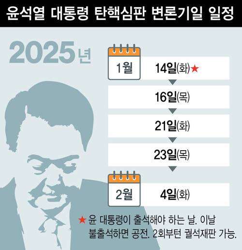 윤 대통령은 고위공직자범죄수사처의 체포영장 집행에도 응하지 않고 경호처의 옹위를 받으며 ‘옥쇄 투쟁’을 벌이고 있지만, 헌재 탄핵심판에는 출석하겠다는 뜻을 밝혔다. 윤 대통령 쪽 윤갑근 변호사는 5일 “대통령은 적정한 기일에 출석하여 의견을 밝힐 예정”이라고 밝혔다. 만약 1차 변론기일(1월14일)에 윤 대통령이 불출석하면 재판은 공전되지만 16일 2차 변론기일부터는 윤 대통령이 출석하지 않아도 재판은 진행된다. 윤 대통령은 본인이 판단하기에 직접 변론 효과를 극대화할 수 있는 시점에 헌재에 나올 것으로 예상된다. 윤 대통령은 지난 1일 “나라 안팎의 주권침탈세력과 반국가세력의 준동으로 지금 대한민국이 위험하다”, “여러분과 함께 이 나라를 지키기 위해 끝까지 싸울 것”이라는 메시지를 내는 등 지지층 결집을 시도 중이다.