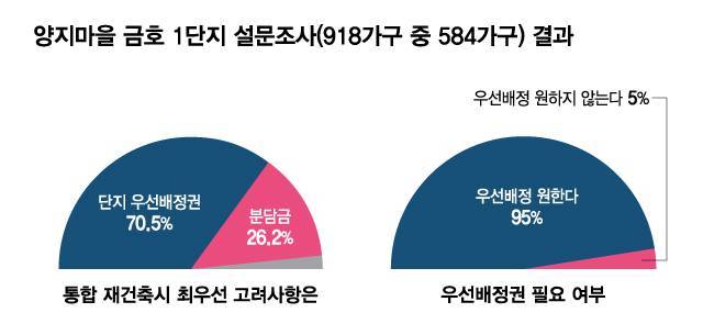 이번 설명회에서 공개된 주민 설문조사에 따르면 금호 1단지 입주민 중 70.5%는 통합재건축시 최우선 고려사항으로 '금호 1단지 내 우선배정권'을 꼽았다. 우선배정권은 원래 단지 동을 재건축 후에도 우선 배정받을 수 있는 권리다. 주민들 10명 중 9명 이상(95%)가 우선배정권이 필요하다고 답했다. 이번 설문은 금호1단지 918가구 중 584가구를 대상으로 이뤄졌다. 분담금이 중요하다는 비율은 26.2%이었다.