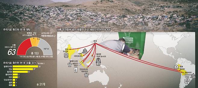 ‘기부든 헐값이든, 저소득층이 많은 나라에서는 헌 옷을 잘 입겠지’라는 생각은 선진국 사람들의 착각이다. 영국의 엘런맥아더재단은 매해 발생하는 세계 의류 쓰레기 약 4700만t(2017년 기준) 중 87%가 쓰레기로 처리된다고 분석했다. 국내에서도 많은 사람들이 재활용될 거라는 기대로 헌 옷을 죄책감 없이 의류수거함에 넣지만, 실상은 다르다. 국내에서 수거된 헌 옷이 중고 의류 수출업체를 통해 동남아시아·아프리카로 판매되는 건 맞지만, 상당수는 재활용되지 못한 채 소각되거나 매립되는 것으로 추정된다. 국내 폐의류 발생 및 처리 현황을 가늠해볼 수 있는 제대로 된 통계가 없는 상황에서, 한겨레는 의류수거함에 버려진 옷에 스마트태그와 지피에스(GPS·글로벌포지셔닝시스템) 추적기 153개를 달아 직접 헌 옷의 이동 경로를 추적했다. 국내는 물론 인도·타이 현지까지 헌 옷의 행방을 추적해 재활용 여부와 심각한 환경 오염 실태를 세차례에 걸쳐 싣는다.