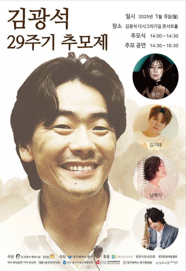 한편 대구 중구는 오늘 6일 오후 2시 김광석다시그리기길 야외콘서트홀 일대에서 김광석의 29주기를 추모하는 행사를 개최한다.