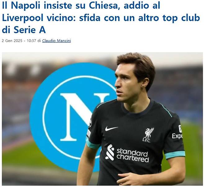 이탈리아 매체 '풋메르카토'는 5일(한국시간) SSC 나폴리가 키에사 영입전에서 가장 앞서있다고 주장했다. 매체는 "나폴리가 남은 시즌 동안 키에사를 임대 영입하고 싶어 한다"며 "리버풀은 에이전트 팔라 라마디니와 논의 끝 그를 내보내는 데 동의했고, 이미 아우렐리오 데 라우렌티스 회장·안토니오 콘테 감독과 대화를 나눴다"고 보도했다.