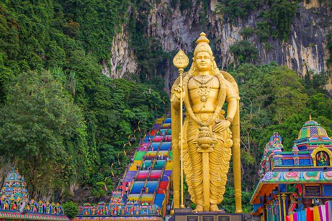 힌두교 신자의 성지라 불리는 바투동굴. 4억 년 이상의 석회암으로 이루어졌다. 동굴 근처의 바투강에서 이름을 따왔다. 입구에는 높이가 140피트(약 42.7m)가 넘는 거대한 황금 무루간 상을 볼 수 있는데, 힌두교의 전쟁과 승리의 신이라고 한다. 그 뒤로는 알록달록한 272개의 계단이 펼쳐진다. 동굴이 절벽 높은 곳에 형성돼 있어 계단을 올라야 한다. 그나마 힘이 덜 들게 느껴지는 건 방문객의 가방을 노리거나 신나게 뛰어다니는 장난꾸러기 원숭이들을 경계해야 하기 때문이다.