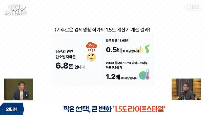 ◇ 김병권> 6.8톤이면 굉장히 기후나 환경을 많이 생각하시면서 생활하시는 게 틀림없다고 봅니다. 지금 공식 통계로는 한국인 1인당 12톤 정도 내외를 배출하는 걸로 나와 있거든요. 6.8톤이면 거의 절반이죠. 2030년까지 국가가 40%를 줄여야 되잖아요. 뒤집어서 말하면 대한민국 5160만 국민 모두가 2030년쯤 되면 지금의 절반에 가까운 40%씩 줄어야 되는데 6.8톤 정도면 거의 근접한 거니까 상당히 적은 거죠.