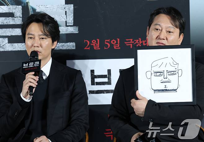 (서울=뉴스1) 권현진 기자 = 배우 정만식(오른쪽)이 6일 서울 광진구 자양동 건대입구 롯데시네마에서 진행된 영화 '브로큰'(감독 김진황) 제작보고회에 참석해 김남길이 그려준 자신의 몽타주를 들고 포즈를 취하고 있다.