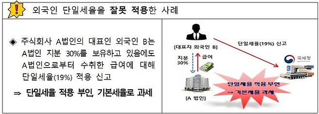 외국인 근로자가 근로를 제공하는 법인 지분의 30% 이상을 보유한 특수관계기업에 고용된 경우는 이같은 단일세율 특례 적용 대상에서 제외된다.