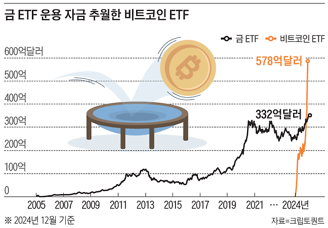 “세계 최대 자산운용사인 블랙록이 2024년 초 비트코인 ETF를 출시했는데, 해를 넘기기도 전에 20년 가까이 된 금 ETF의 운용 자산(AUM)을 초과했다. 크립토퀀트 분석에 따르면, 블랙록 비트코인 ETF에는 2024년 9~12월 기준 매주 평균 11억8000만달러(약 1조6906억원)가 들어오고 있다. 비트코인 ETF가 비트코인 거래의 포문을 열었다고 생각한다.