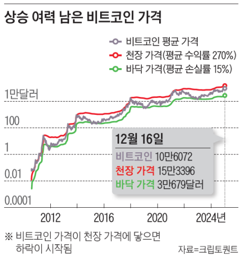 비트코인 가격이 심리적 저항선이었던 10만달러(약 1억4327만원)를 돌파하며 연일 사상 최고치를 기록했다. 도널드 트럼프 미국 대통령 당선인이 비트코인 전략적 비축 기금(bitcoin strategic reserve fund)을 추진할 것이라고 밝히면서, 비트코인 가격이 향후 50만달러(약 7억1635만원)까지 상승할 수 있다는 전망까지도 나온다. 일각에서는 이미 가격이 고점에 이르렀으며, 향후 절반 아래로 추락할 수 있다는 경고도 나온다.