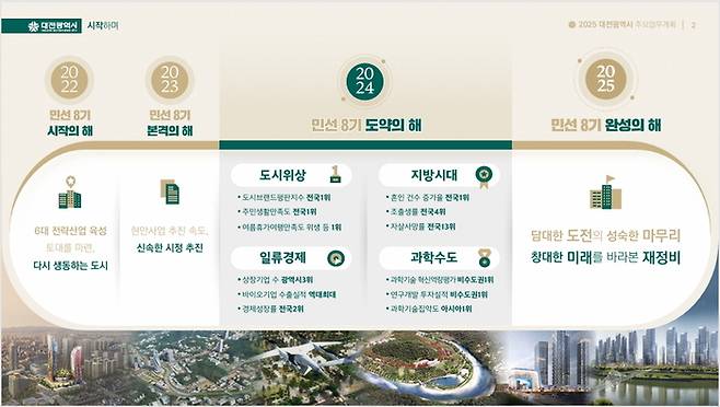 특히 0시 축제 2년 연속 성공적 개최, 꿈씨패밀리 전국적 유명세, 전국 최초 도시철도 2호선 수소트램 추진, 도시철도 3·4·5호선 노선안 확정, 제2문화예술복합단지 기획디자인에 세계적 건축가 참여, 2048 그랜드플랜 비전 발표 등으로 대전 도시 위상이 전국적 수준으로 높아졌다.