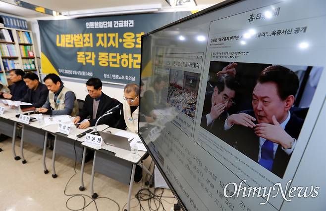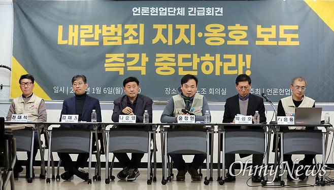 | ▲ 언론현업단체, 내란범죄 지지-옹호 보도 즉각 중단 촉구! 언론노조와 한국기자협회, 방송기자연합회, 한국PD연합회, 한국영상기자협회 등 총 8개 언론현업단체들이 6일 오후 서울 중구 언론노조 회의실에서 긴급회견을 열고 '윤석열 내란 동조 보도와 논설 실태' 등을 발제하며 "내란범죄 지지 및 옹호 보도 즉각 중단"을 촉구하고 있다. |