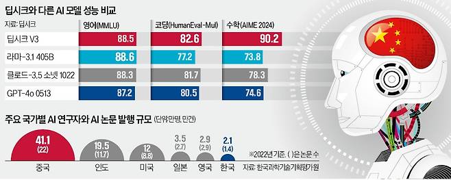 업계가 주목한 건 개발 과정이다. 딥시크는 V3를 개발하면서 엔비디아의 반도체 H800 구동 시간 기준으로 278만8000시간을 훈련했다고 밝혔다. 비용으로 따지면 557만달러(약 82억원) 정도다. 라마 3.1의 개발비(엔비디아 H100 1만6000대 투입 기준) 6억4000만달러(약 9406억원)의 100분의 1 수준이다. 오픈AI 공동 창업자이자 테슬라의 자율주행 기술 개발을 주도한 안드레이 카파시는 소셜미디어 X에서 “최첨단의 LLM을 웃음이 나올 정도로 적은 예산으로 만들었다”며 딥시크를 극찬했다.